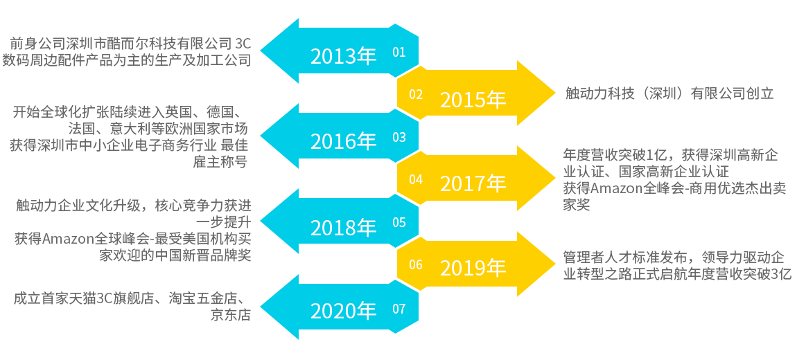 触动力是一家年轻、充满活力,并致力于以品牌与品质为发展引导方向的跨境电子商务零售公司。 为全球个人及家庭提供高品质的消费类产品,在全球拥过上百项专利、商标等自主知识产权,客户遍 布全球30多个国家和地区。触动力奉行“专注、持续创新、以奋斗者为本”的核心价值理念,打造一个 释放价值、公平、分享平台。自2015年成立以来,触动力几何式倍增的高速发展,成为中国跨境电商 成长最快的企业之一。触动力正以惊人的发展速度及稳健步伐铸就中国品牌的非凡影响力,以打造精 细品牌的全球格局和视野,以“大局观、全球观、未来观”为指导,以“一带一路”为契机,积极与全球 市场一体化,抢占发展新机遇。